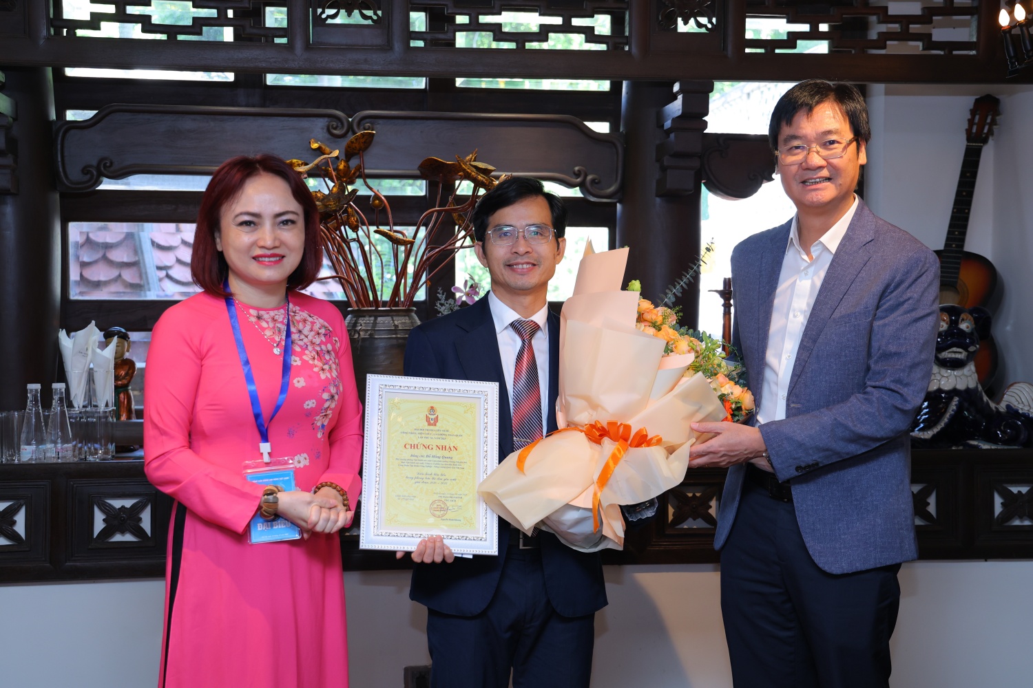 | Đồng chí Nghiêm Thùy Lan - Chủ tịch Công đoàn Petrovietnam và đồng chí Nguyễn Mạnh Kha - Phó Chủ tịch Thường trực Công đoàn Petrovietnam trao tặng Giấy chứng nhận và tặng hoa chúc mừng cá nhân điển hình tiên tiến. |