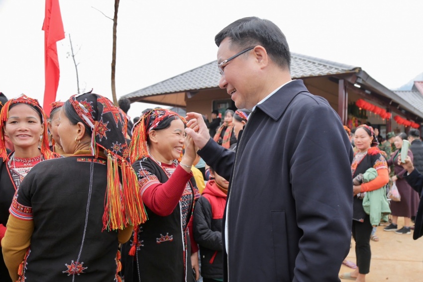| Lãnh đạo Tập đoàn Công nghiệp - Năng lượng Quốc gia Việt Nam và tỉnh Lào Cai thăm các hộ dân thôn Kho Vàng được nhận nhà mới. |