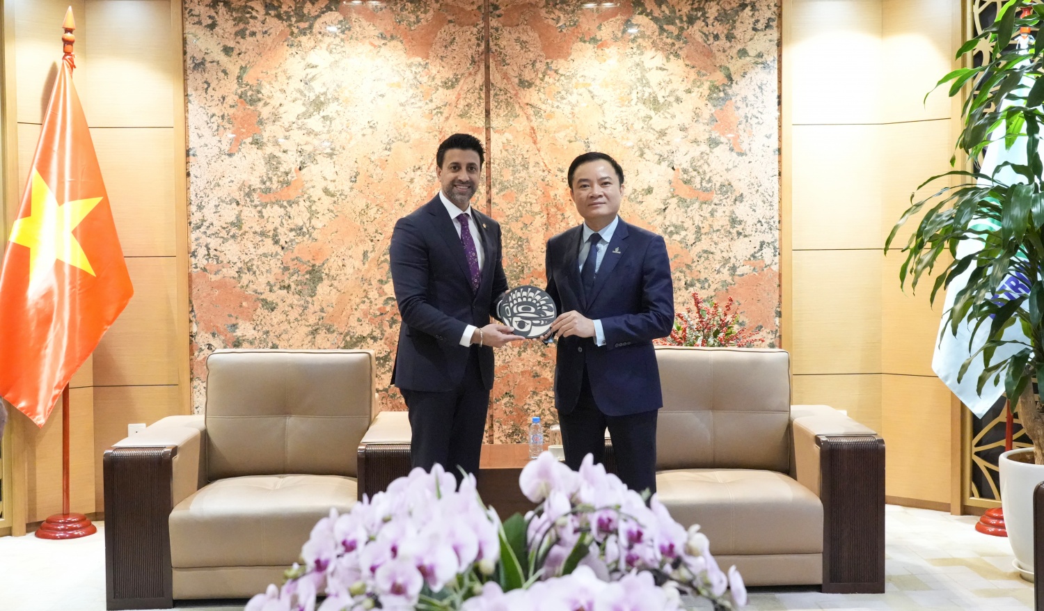 | Bộ trưởng Thương mại Quốc tế Canada Maninder Sidhu và Chủ tịch HĐTV Petrovietnam Lê Ngọc Sơn trao biểu trưng kỷ niệm tại buổi làm việc. |