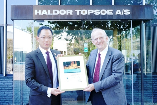 Đại diện Công ty Haldor Topsoe A/S đã trao Chứng nhận Vận hành xuất sắc Nhà máy Đạm Phú Mỹ cho Tổng giám đốc PVFCCo Cao Hoài Dương
