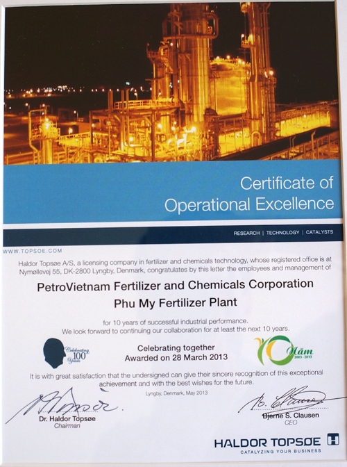 Với thành tích vận hành an toàn, ổn định, đạt và vượt công suất thiết kế trong nhiều năm, cộng với kỷ lục thứ 2 thế giới về 188 ngày vận hành liên tiếp không dừng máy của Nhà máy Đạm Phú Mỹ, ông Bjerne S. Clausen, Tổng giám đốc Haldor Topsoe A/S đã trao cho PVFCCo Chứng nhận vận hành xuất sắc Nhà máy Đạm Phú Mỹ (Certificate of Operational Excellence) và nhiệt liệt chúc mừng PVFCCo bước vào tuổi thứ 10 trong hành trình phát triển.