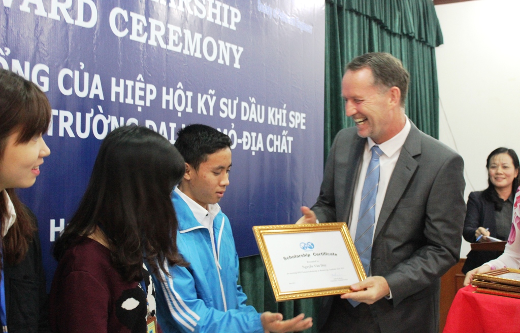 Bên cạnh hoạt động khoa học kỹ thuật thì SPE luôn dành những suất học bổng trao cho các sinh viên có hoàn cảnh khó khăn, học giỏi ở các trường ĐH Mỏ - Địa Chất Hà Nội, ĐH Bách Khoa TP. HCM và ĐH Khoa học Tự nhiên TPHCM (ĐH Quốc gia TPHCM). Đồng thời, ông Tony Roche nhấn mạnh: “Thông qua học bổng SPE, các bạn sinh viên sẽ tiếp tục cố gắng học tập tiếp cận công nghệ tìm kiếm, thăm dò và khai thác dầu khí có hiệu quả nhất. Chúng tôi mong muốn trong tương lai, những sinh viên giỏi từng nhận học bổng của SPE sau khi tốt nghiệp sẽ làm việc trong ngành dầu khí”.